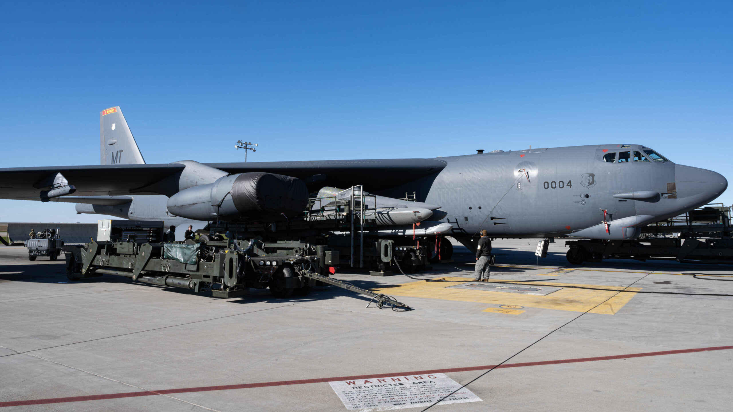 U.S. Airmen assigned to the 5th Maintenance Group, Minot Air Force Base, North Dakota, load AGM-86 air-launched cruise missiles onto a B-52H Stratofortress assigned to the 5th Bomb Wing